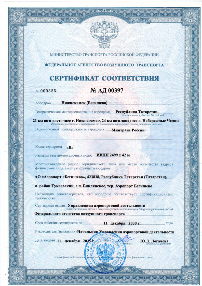 descriptionСертификат аэродрома Нижнекамск (Бегишево)